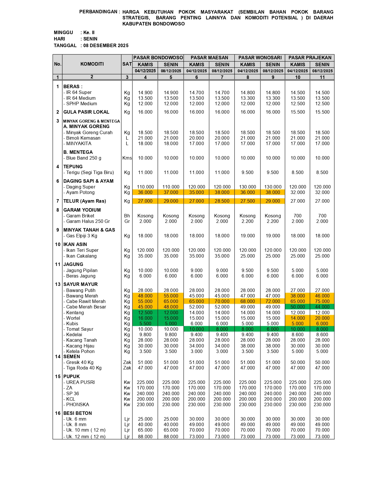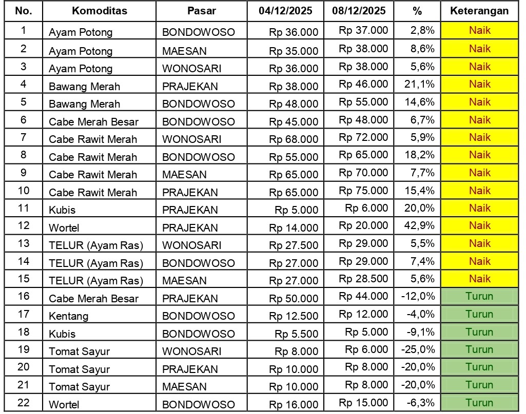 Bondowoso — Berdasar hasil monitoring perkembangan harga sembilan bahan pokok, barang strategis, dan komoditas penting lainnya pada 8 Desember 2025 menunjukkan adanya fluktuasi harga di empat pasar utama Kabupaten Bondowoso. Dibandingkan dengan harga pada 4 Desember 2025, beberapa komoditas tercatat mengalami kenaikan cukup signifikan, khususnya komoditi bumbu dapur dan sayuran, sementara sebagian lainnya justru turun.