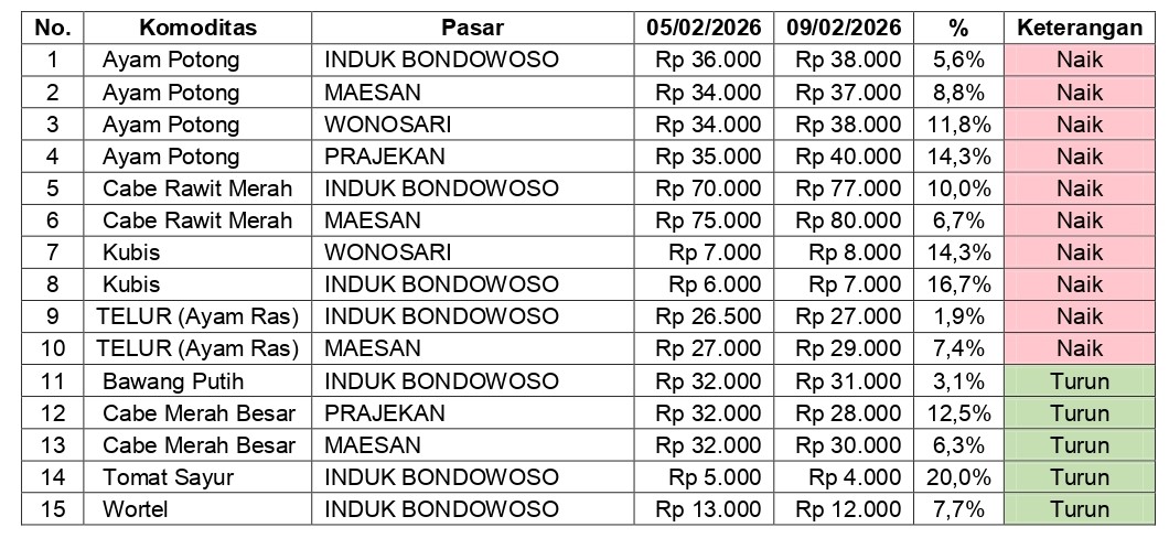 Bondowoso-Berdasarkan hasil monitoring perkembangan harga sembilan bahan pokok kebutuhan masyarakat, barang strategis, dan barang penting lainnya pada 9 Februari 2026, terpantau adanya perubahan harga pada sejumlah komoditas dibandingkan hasil monitoring sebelumnya tanggal 5 Februari 2026. Perubahan harga tersebut terjadi di empat pasar pantauan (Pasar Induk, Maesan, Wonosari, dan Prajekan), baik berupa kenaikan maupun penurunan, dengan tingkat disparitas yang bervariasi.