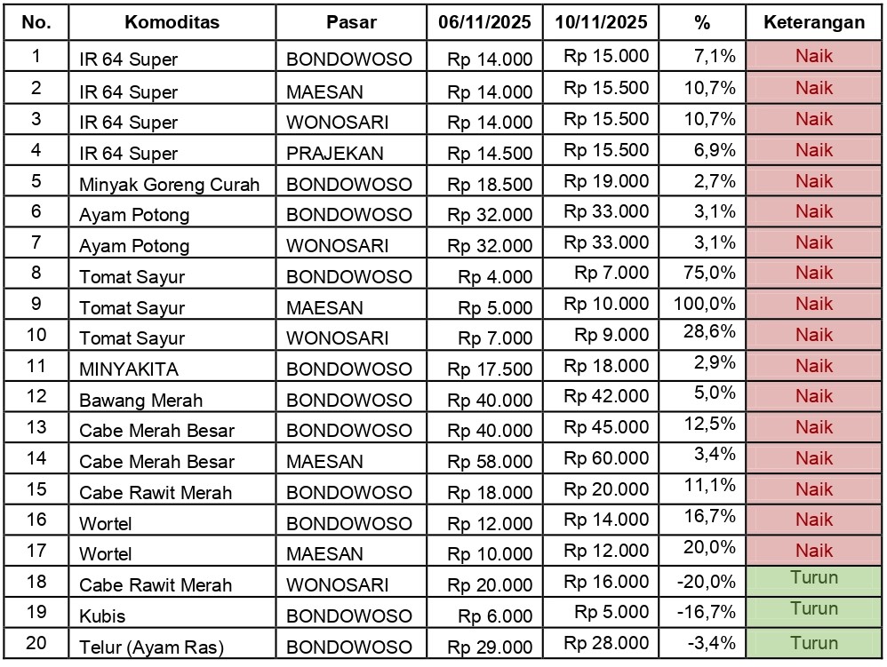 Meski sebagian besar komoditas naik, terdapat beberapa komoditas yang justru mengalami penurunan harga, yaitu: Cabe Rawit Merah di Pasar Wonosari turun 20%, dari Rp20.000 menjadi Rp16.000 per kilogram. Kubis di Pasar Induk Bondowoso turun 16,7%, menjadi Rp5.000 per kilogram. Telur Ayam Ras di Pasar Induk Bondowoso turun 3,4%, dari Rp29.000 menjadi Rp28.000 per kilogram