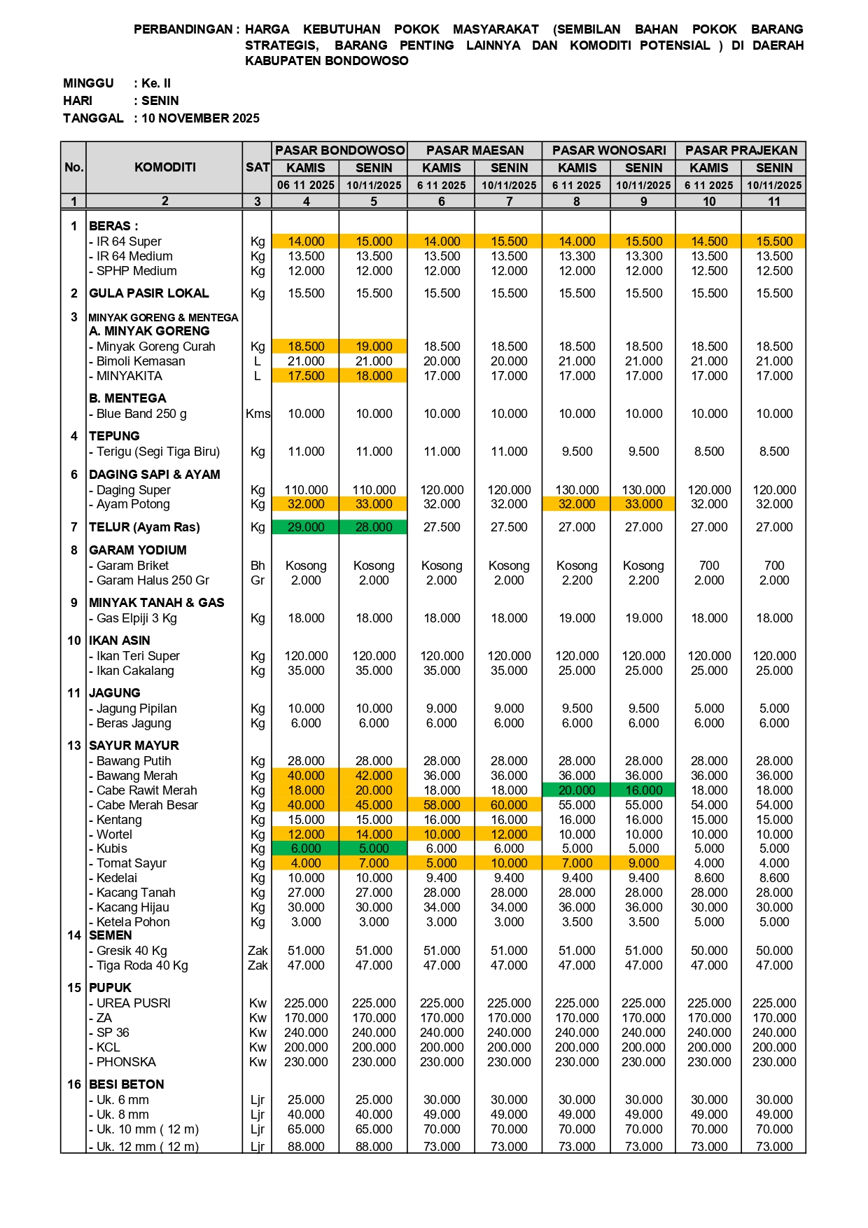 Bondowoso, 10 November 2025 — Tim monitoring harga Diskoperindag Kab. Bondowoso kembali melakukan pemantauan perkembangan harga sembilan bahan pokok, barang strategis, dan barang penting lainnya di empat pasar utama Kabupaten Bondowoso, yakni Pasar Induk Bondowoso, Pasar Maesan, Pasar Wonosari dan Pasar Prajekan pada Senin (10/11). Hasil pemantauan menunjukkan adanya perubahan harga pada sejumlah komoditas dibandingkan dengan harga pada 6 November 2025 lalu.