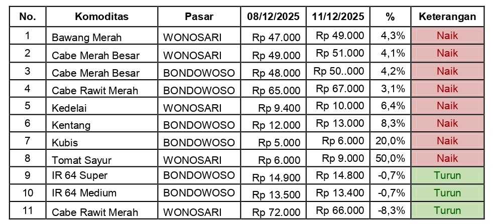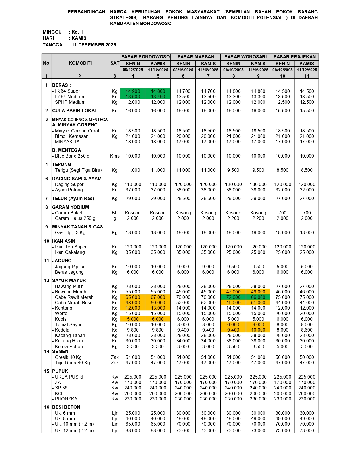 Bondowoso — Hasil monitoring perkembangan harga sembilan bahan pokok, barang strategis, dan komoditas penting lainnya pada 11 Desember 2025 menunjukkan adanya perubahan harga pada beberapa komoditas di empat pasar utama Kabupaten Bondowoso, khususnya di Pasar Induk Bondowoso dan Pasar Wonosari. Perubahan tersebut terdiri dari kenaikan harga pada sejumlah komoditas serta penurunan pada beberapa lainnya.
