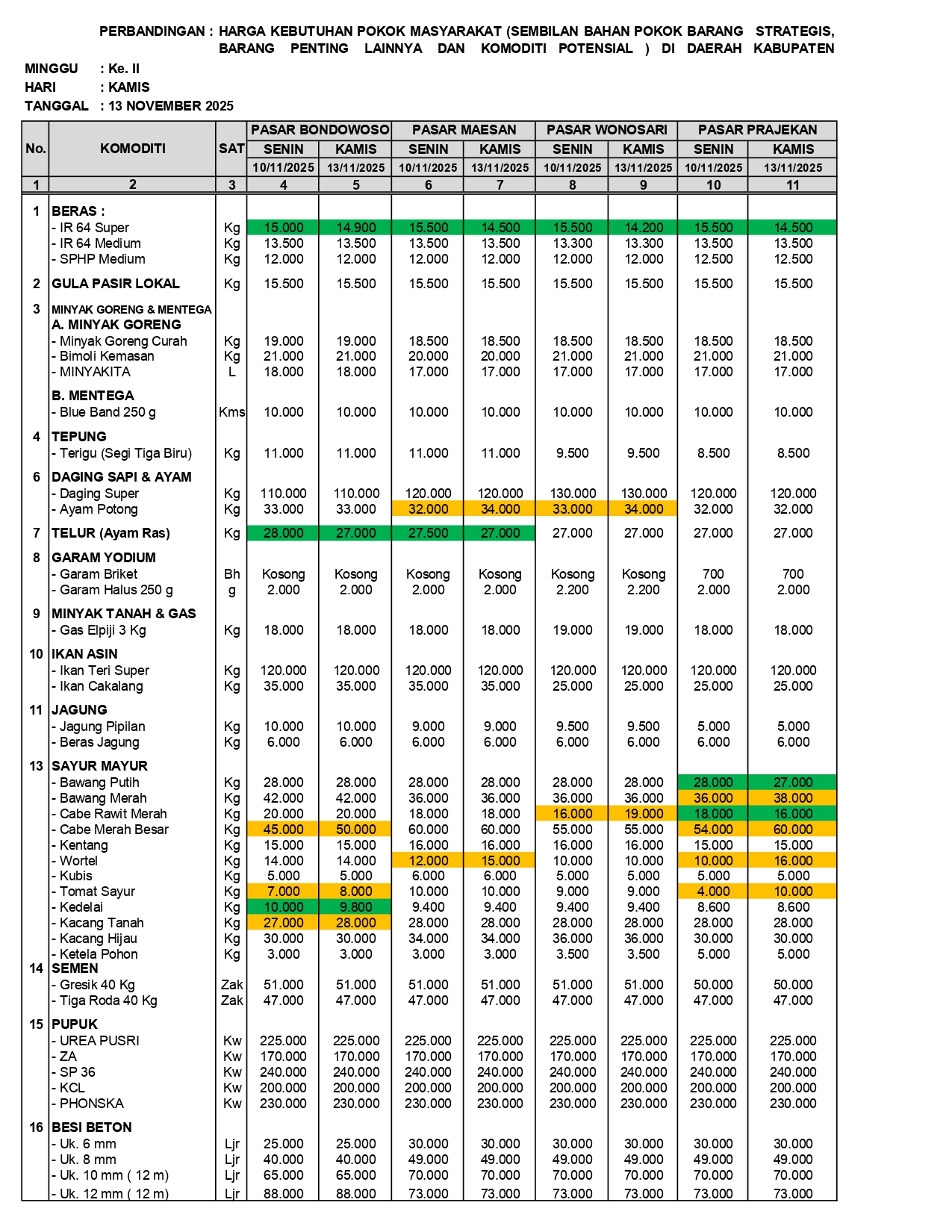 Bondowoso, 13 November 2025 — Tim monitoring harga Diskoperindag Kabupaten Bondowoso kembali mencatat adanya dinamika harga pada sejumlah komoditas pangan pokok, barang strategis, dan barang penting lainnya di beberapa pasar tradisional. Pemantauan yang dilakukan di empat Pasar Utama Kab.Bondowoso yakni Pasar Induk Bondowoso, Pasar Maesan, Pasar Wonosari dan Pasar Prajekan pada Kamis (13/11) menunjukkan perubahan harga yang bervariasi dibandingkan kondisi pada 10 November 2025 lalu.