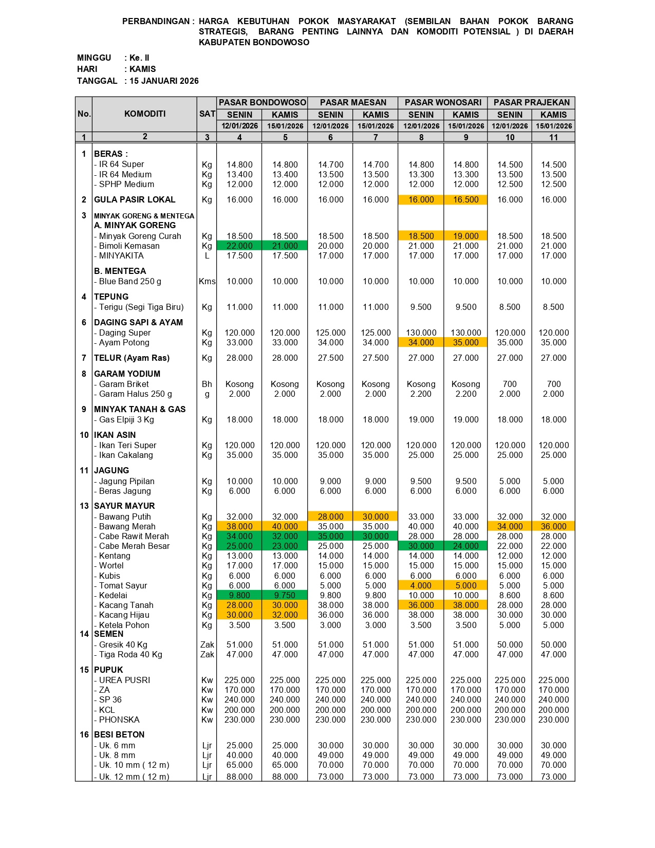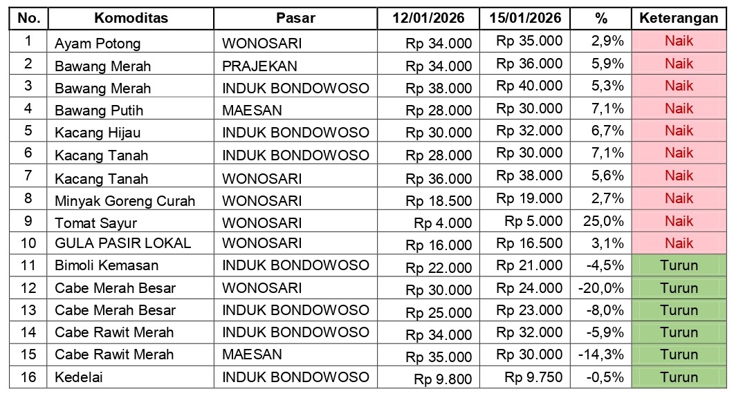 Bondowoso - Berdasarkan laporan hasil monitoring perkembangan harga sembilan bahan pokok kebutuhan masyarakat, barang strategis, dan barang penting lainnya pada 15 Januari 2026, terpantau adanya sejumlah komoditas yang mengalami perubahan harga di empat pasar utama Kabupaten Bondowoso (Pasar Induk Bondowoso, Pasar Maesan, Pasar Wonosari dan Pasar Prajekan) dibandingkan dengan hasil monitoring sebelumnya pada 12 Januari 2026. Perubahan harga tersebut meliputi kenaikan dan penurunan dengan besaran disparitas yang bervariasi.