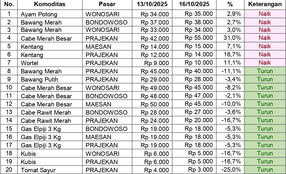Dari hasil monitoring pada 16 Oktober 2025, juga terdapat beberapa komoditas yang mengalami penurunan harga. Di Pasar Prajekan misalnya Komoditas Bawang Merah di Pasar turun signifikan yakni -11,1% (dari Rp 45.000 menjadi Rp 40.000) dan komoditas Bawang Putih turun Rp 1.000 menjadi Rp 28.000.