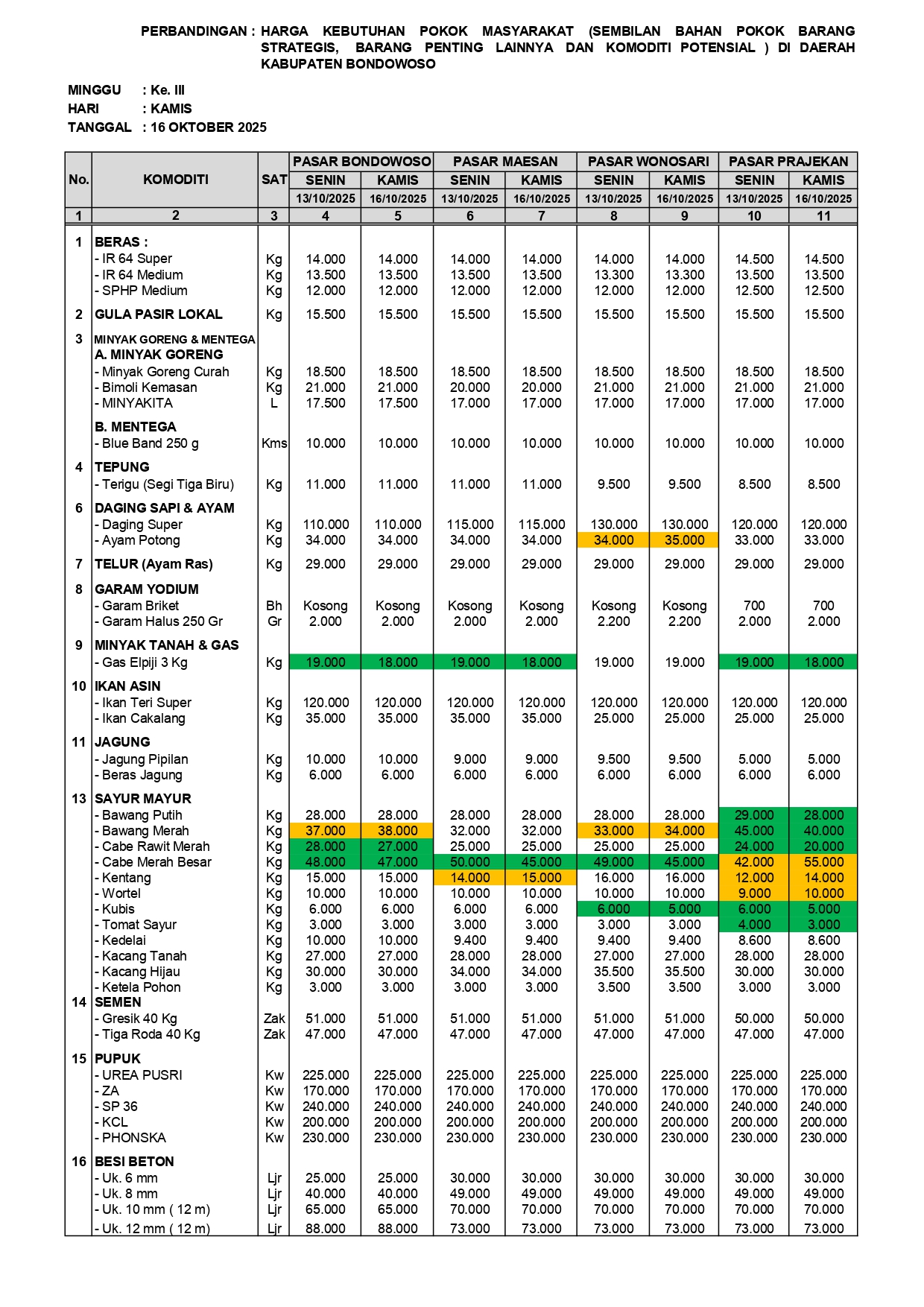 Berikut laporan hasil monitoring perkembangan harga sembilan bahan pokok kebutuhan masyarakat, barang strategis dan barang penting lainnya pada Kamis Tanggal 16 Oktober 2025.