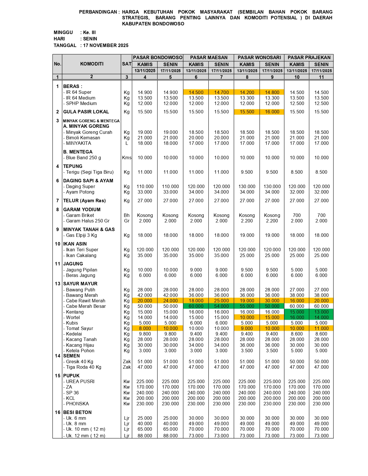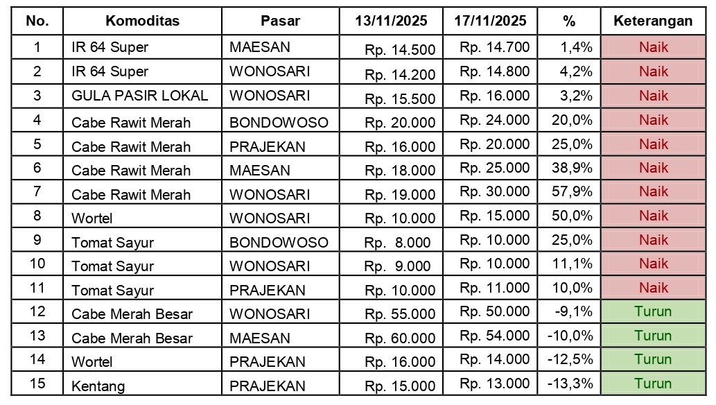 BONDOWOSO – Hasil pemantauan harga kebutuhan pokok di empat pasar utama Kabupaten Bondowoso, yakni Pasar Induk Bondowoso, Pasar Maesan, Pasar Wonosari dan Pasar Prajekan pada 13 hingga 17 November 2025 menunjukkan pergerakan harga yang dinamis. Beberapa komoditas tercatat mengalami kenaikan signifikan, sementara sebagian lainnya justru turun.
