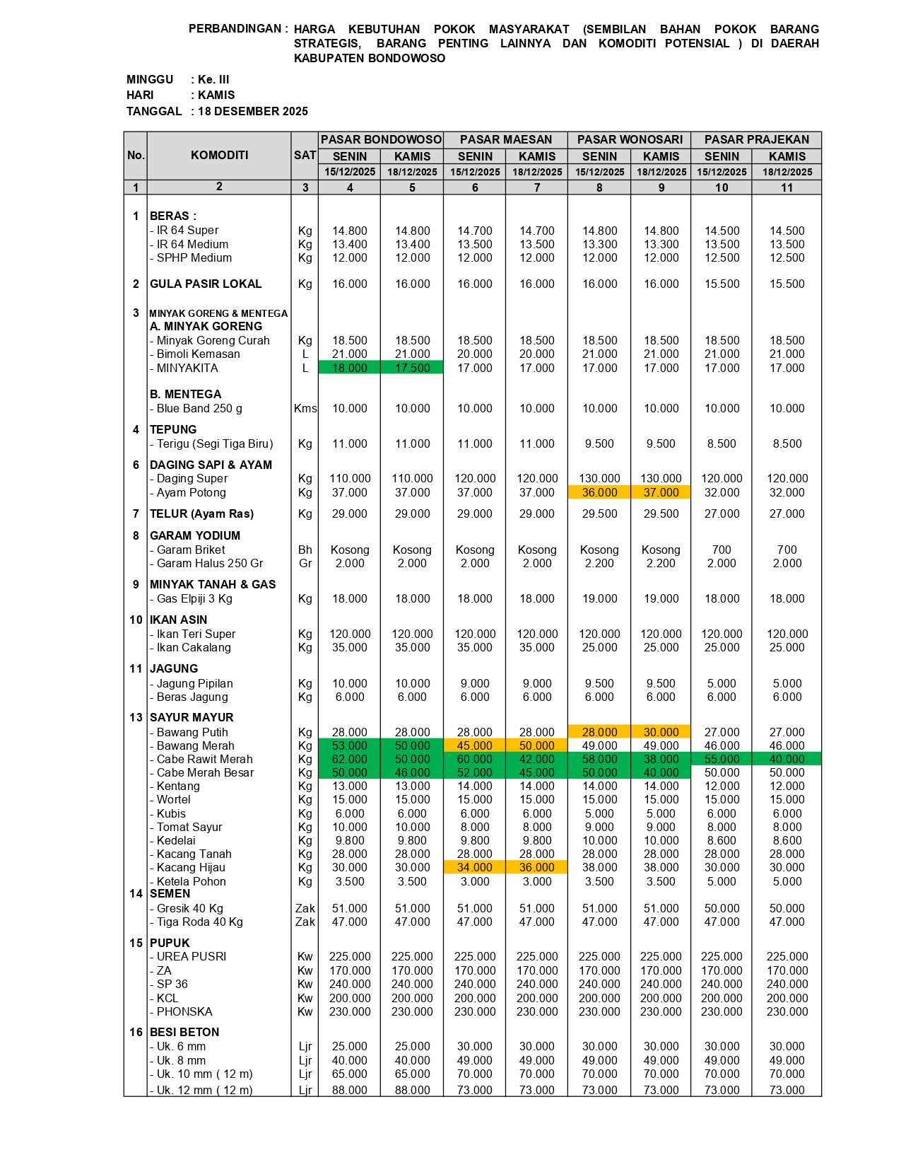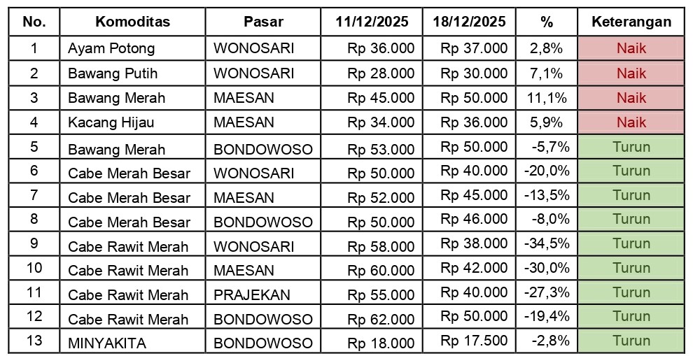 Bondowoso-Berdasarkan hasil monitoring perkembangan harga sembilan bahan pokok kebutuhan masyarakat, barang strategis, dan barang penting lainnya pada Kamis, 18 Desember 2025, terpantau adanya perubahan harga pada sejumlah komoditas di empat pasar utama Kabupaten Bondowoso dibandingkan periode sebelumnya, yakni 11 Desember 2025.