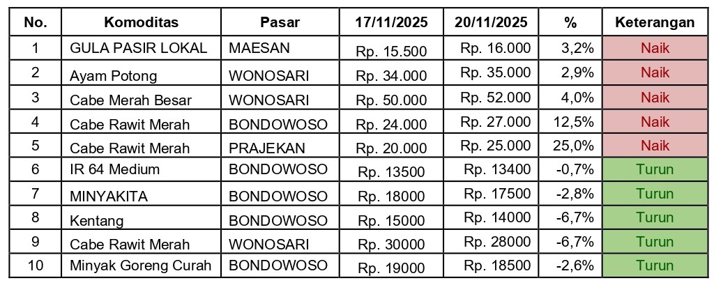 Sejumlah komoditas tercatat mengalami kenaikan harga. Gula Pasir Lokal di Pasar Maesan naik dari Rp15.500 menjadi Rp16.000 per kilogram atau meningkat Rp 500. Ayam potong di Pasar Wonosari naik Rp 1.000 menjadi Rp35.000 per kilogram dari harga sebelumnya Rp34.000. Kenaikan juga terjadi pada komoditas cabai. Cabai Merah Besar di Pasar Wonosari naik 4 persen menjadi Rp52.000 per kilogram. Sementara Cabai Rawit Merah mengalami kenaikan cukup signifikan di dua pasar, yaitu Pasar Induk Bondowoso naik dari Rp24.000 menjadi Rp27.000 (12,5%) dan di Pasar Prajekan dari Rp20.000 menjadi Rp25.000 (25%).