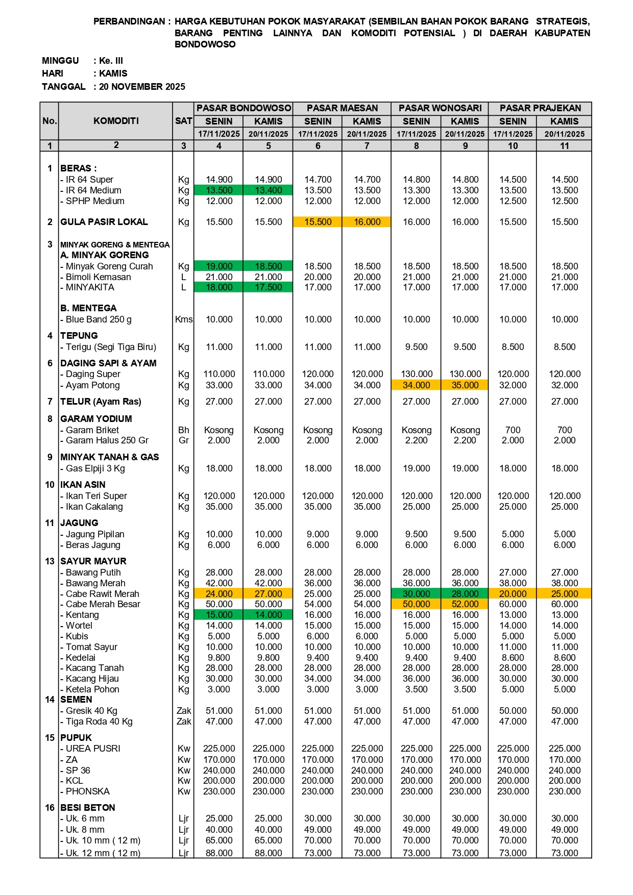 Bondowoso — Pemerintah Kabupaten Bondowoso melalui tim monitoring/pencatat harga pasar kembali melaporkan perkembangan harga sembilan bahan pokok (sembako), barang strategis, dan barang penting lainnya per Tanggal 20 November 2025. Hasil pemantauan di empat pasar utama Kab. Bondowoso yakni Pasar Induk Bondowoso, Pasar Maesan, Pasar Wonosari dan Pasar Prajekan menunjukkan adanya fluktuasi harga pada beberapa komoditas dibandingkan dengan periode pemantauan sebelumnya (17 November 2025).