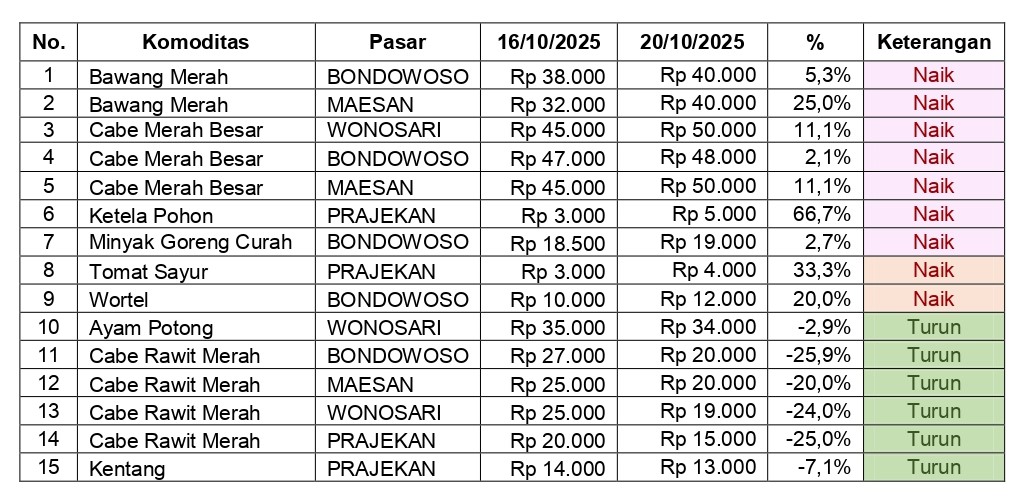 Berdasarkan hasil monitoring harga di empat pasar utama Kabupaten Bondowoso, yaitu Pasar Induk Bondowoso, Pasar Maesan, Pasar Wonosari, dan Pasar Prajekan, tercatat adanya perubahan harga pada sejumlah komoditas pangan pokok, khususnya bumbu dapur.