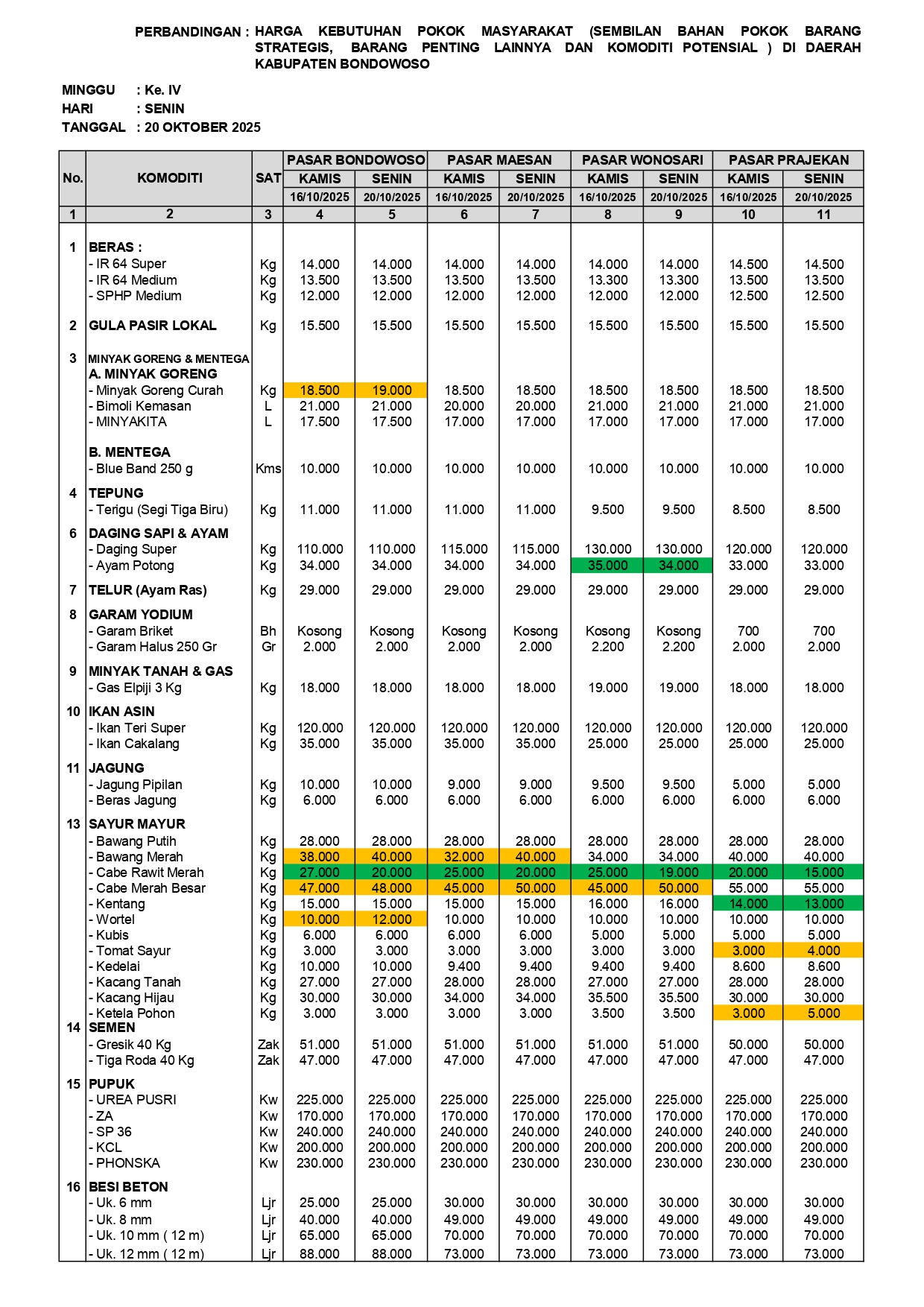 Berikut laporan hasil monitoring perkembangan harga sembilan bahan pokok kebutuhan masyarakat, barang strategis dan barang penting lainnya pada Senin Tanggal 20 Oktober 2025.