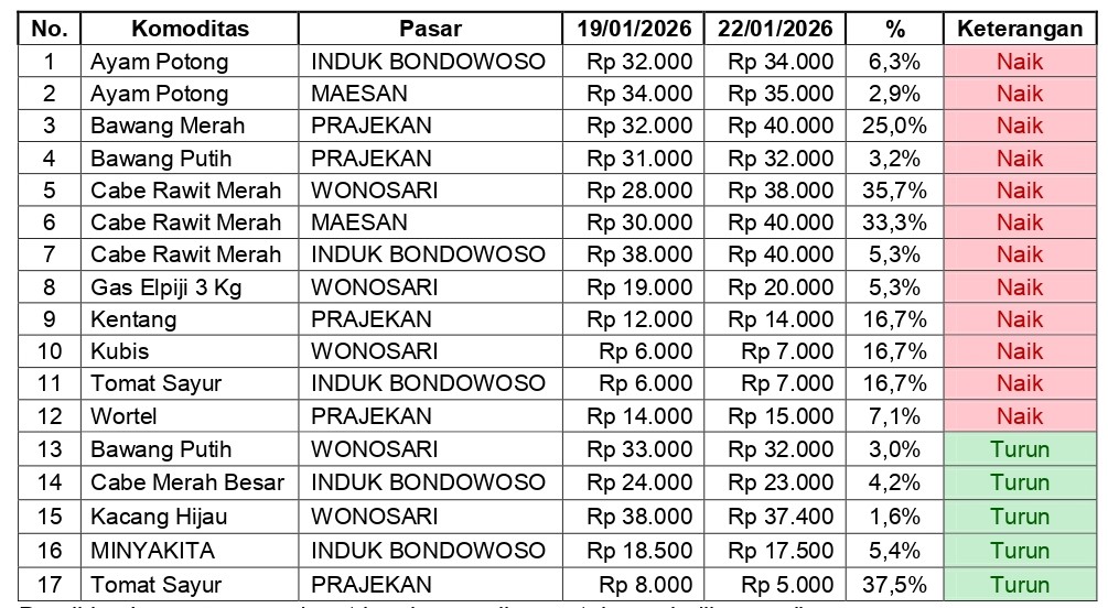 PERKEMBANGAN HARGA BAHAN POKOK PERIODE 19–22 JANUARI 2026: CABE RAWIT MERAH DAN TOMAT ALAMI FLUKTUASI TERTINGGI