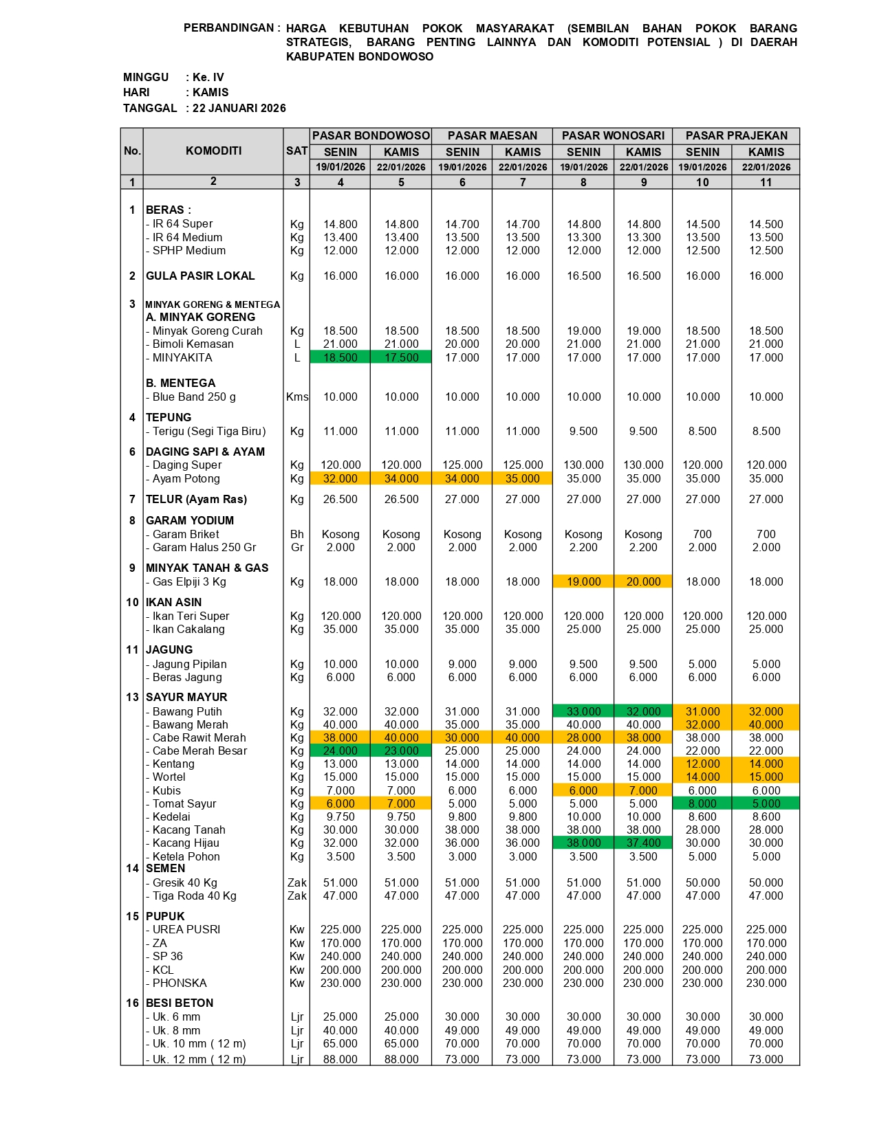 Bondowoso – Dinas Koperasi, Perindustrian dan Perdagangan Kabupaten Bondowoso kembali melaksanakan monitoring perkembangan harga sembilan bahan pokok kebutuhan masyarakat, barang strategis, dan barang penting lainnya pada Kamis, 22 Januari 2026. Hasil monitoring menunjukkan adanya pergerakan harga pada sejumlah komoditas di empat pasar utama Kabupaten Bondowoso, dibandingkan hasil pemantauan sebelumnya pada 19 Januari 2026.
