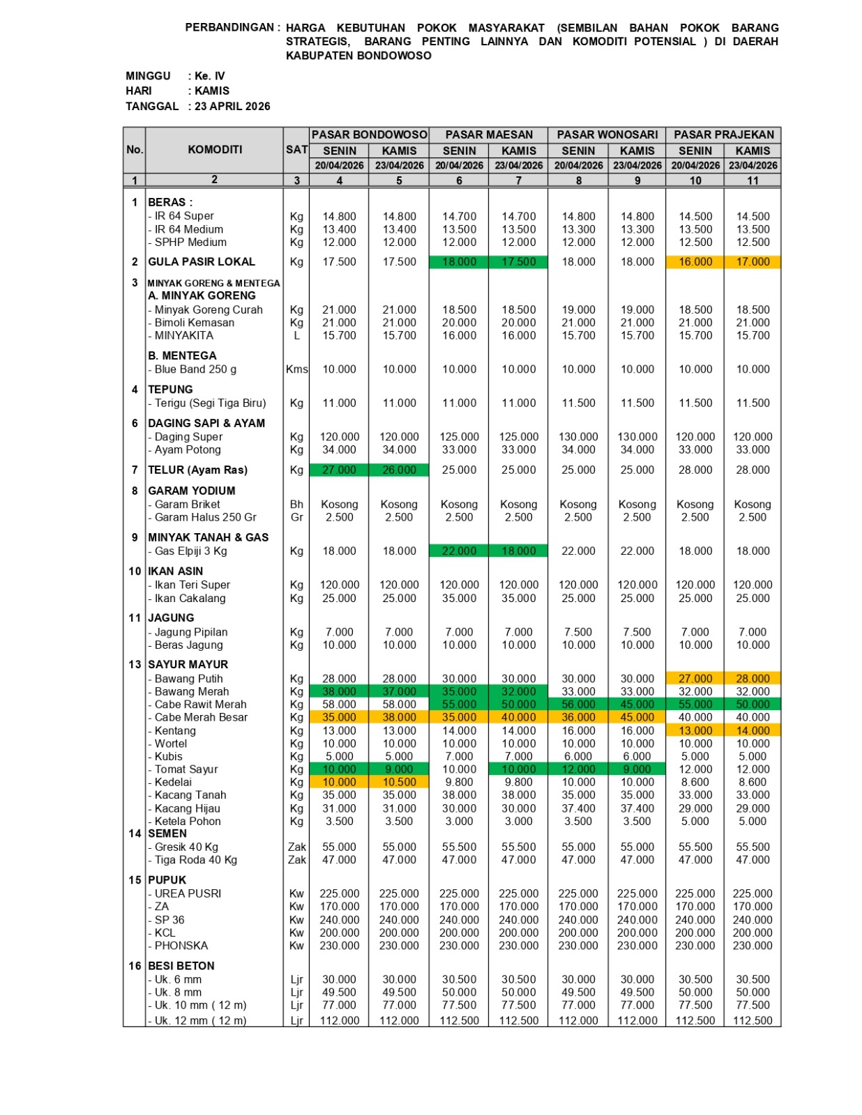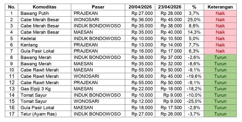 Bondowoso, 23 April 2026 — Perkembangan harga kebutuhan pokok masyarakat di Kabupaten Bondowoso kembali menunjukkan dinamika yang cukup tajam. Berdasarkan hasil monitoring pada 20 hingga 23 April 2026 di empat pasar pantauan, yaitu Pasar Induk Bondowoso, Pasar Maesan, Pasar Wonosari, dan Pasar Prajekan, sejumlah komoditas strategis tercatat mengalami kenaikan maupun penurunan harga.