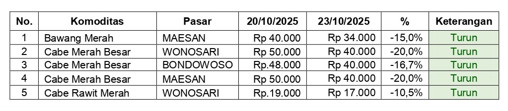 Dari data yang diperoleh, terjadi penurunan harga yang cukup tajam pada komoditas Cabe Merah Besar. Di Pasar Wonosari dan Pasar Maesan, harga cabe merah besar turun Rp 10.000 yakni dari Rp 50.000 menjadi Rp 40.000, dan di Pasar Induk Bondowoso turun Rp 8.000 yakni dari Rp 48.000 menjadi Rp 40.000.