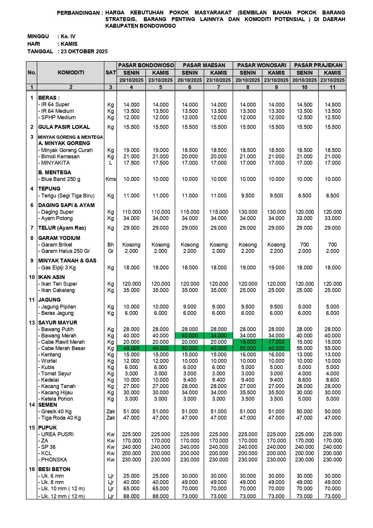 Berikut laporan hasil monitoring perkembangan harga sembilan bahan pokok kebutuhan masyarakat, barang strategis dan barang penting lainnya pada Kamis Tanggal 23 Oktober 2025.