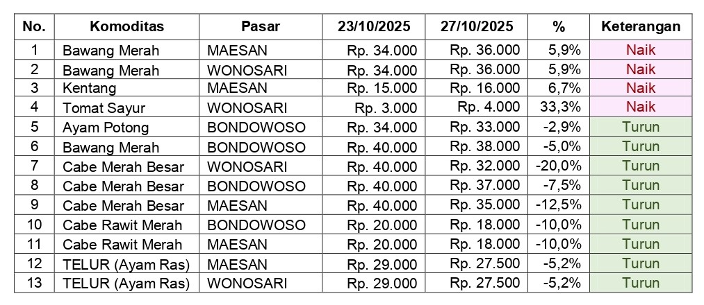 Berdasarkan hasil monitoring harga di empat pasar utama Kabupaten Bondowoso, yaitu Pasar Induk Bondowoso, Pasar Maesan, Pasar Wonosari, dan Pasar Prajekan, tercatat adanya perubahan harga pada sejumlah komoditas pangan pokok, khususnya bumbu dapur.