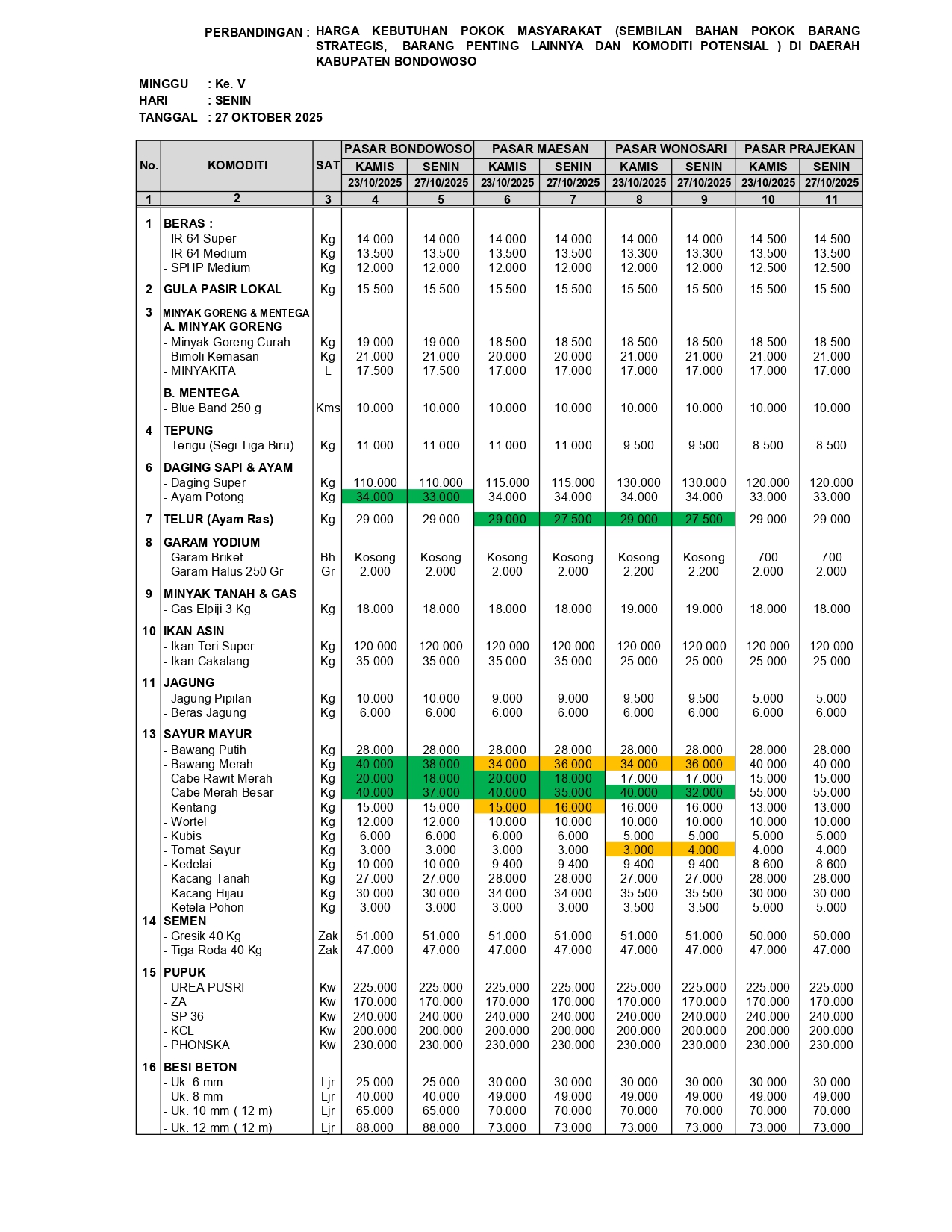 Berikut laporan hasil monitoring perkembangan harga sembilan bahan pokok kebutuhan masyarakat, barang strategis dan barang penting lainnya pada Kamis Tanggal 27 Oktober 2025.