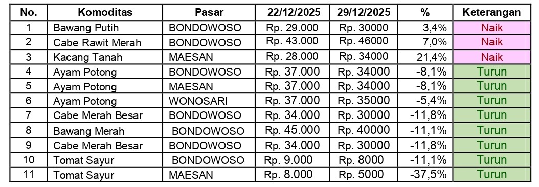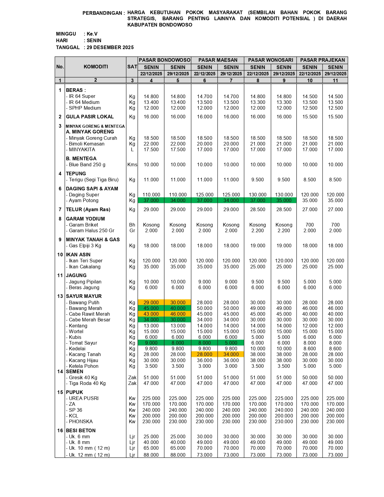 Bondowoso — Berdasar hasil monitoring perkembangan harga sembilan bahan pokok kebutuhan masyarakat, barang strategis, dan barang penting lainnya pada 29 Desember 2025 menunjukkan adanya dinamika harga di empat pasar utama kabupaten Bondowoso dibandingkan periode sebelumnya, yakni 22 Desember 2025. Perubahan harga tersebut meliputi kenaikan dan penurunan dengan disparitas yang bervariasi.