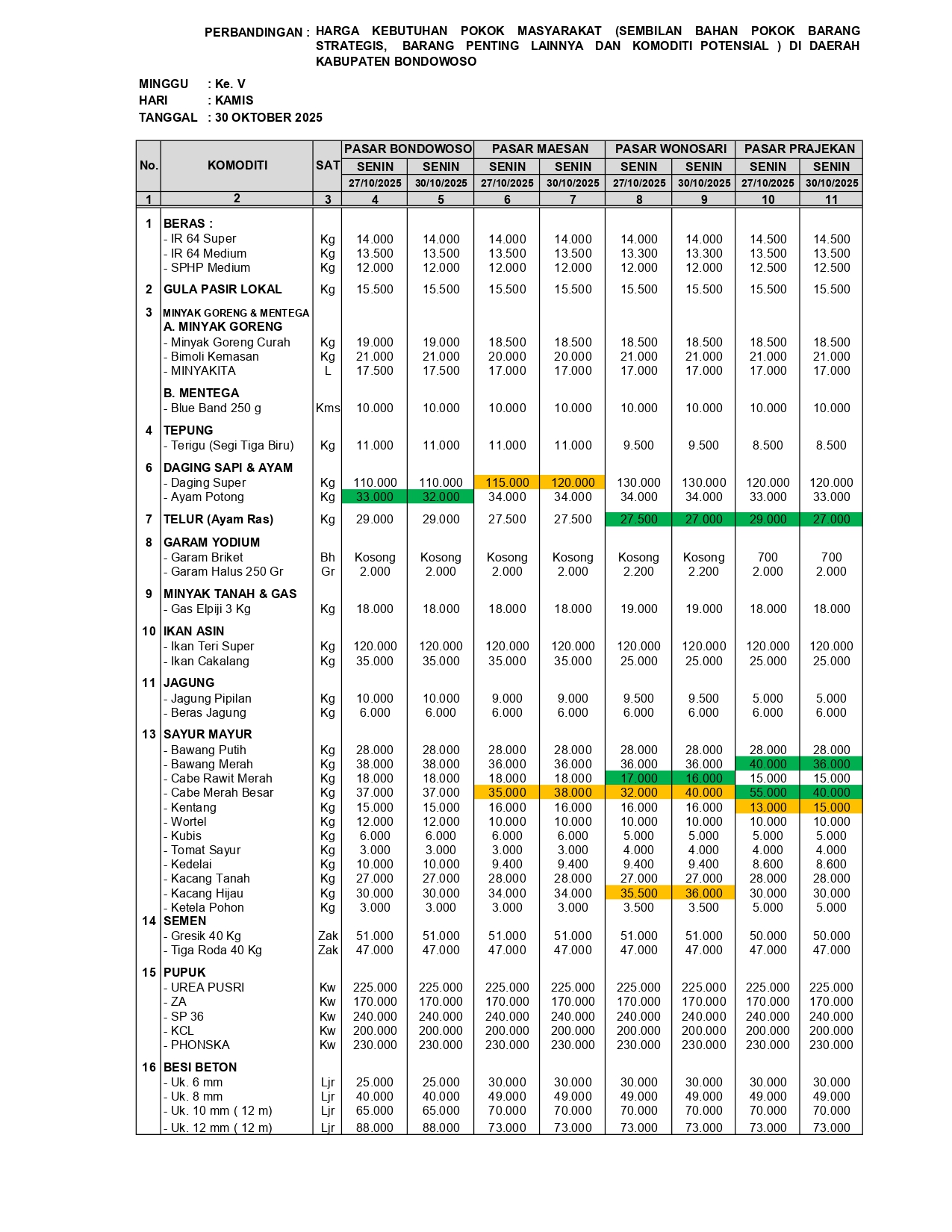 Berikut laporan hasil monitoring perkembangan harga sembilan bahan pokok kebutuhan masyarakat, barang strategis dan barang penting lainnya pada Kamis Tanggal 30 Oktober 2025.