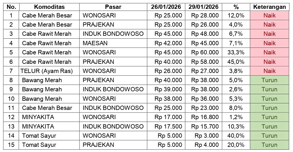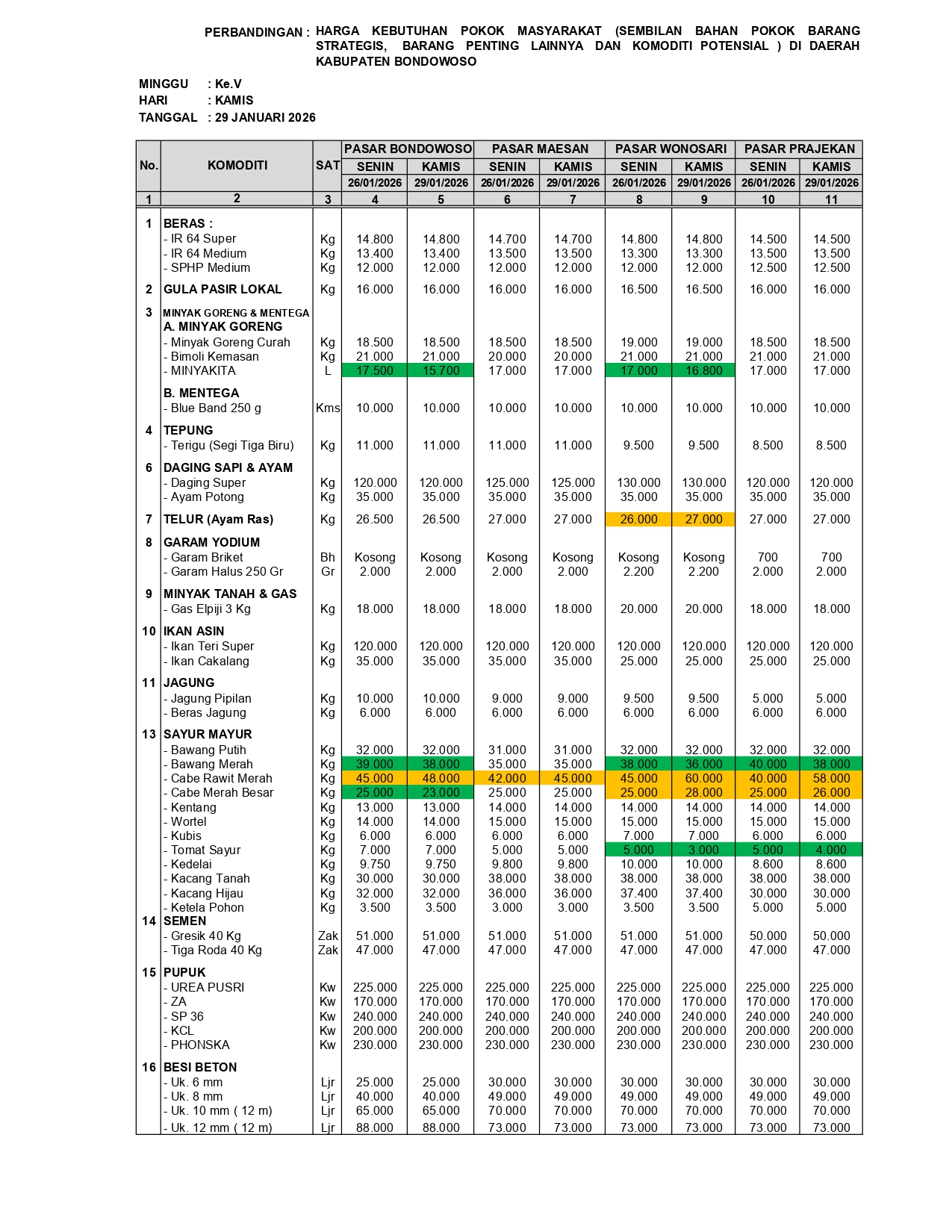 Berdasarkan laporan hasil monitoring perkembangan harga sembilan bahan pokok kebutuhan masyarakat, barang strategis, dan barang penting lainnya pada 29 Januari 2026, terpantau adanya sejumlah perubahan harga pada beberapa komoditas di empat pasar utama Kabupaten Bondowoso (Pasar Induk Bondowoso, Maesan, Wonosari, dan Prajekan) dibandingkan hasil monitoring sebelumnya pada 26 Januari 2026. Perubahan tersebut mencakup kenaikan dan penurunan harga dengan disparitas yang bervariasi antar komoditas dan lokasi pasar.
