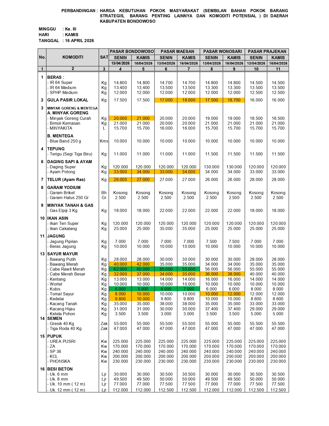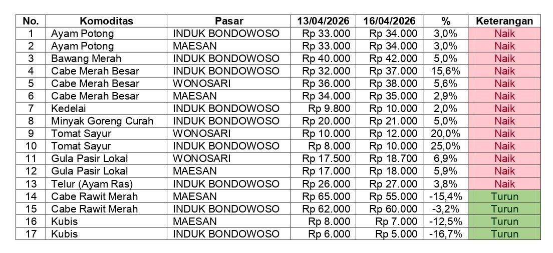 Bondowoso, 16 April 2026 — Perkembangan harga kebutuhan pokok masyarakat di Kabupaten Bondowoso menunjukkan tren kenaikan pada sejumlah komoditas strategis. Berdasarkan hasil monitoring di empat pasar pantauan, yakni Pasar Induk Bondowoso, Pasar Maesan, Pasar Wonosari, dan Pasar Prajekan, tercatat beberapa komoditas mengalami fluktuasi harga signifikan dibandingkan periode 13 April 2026.