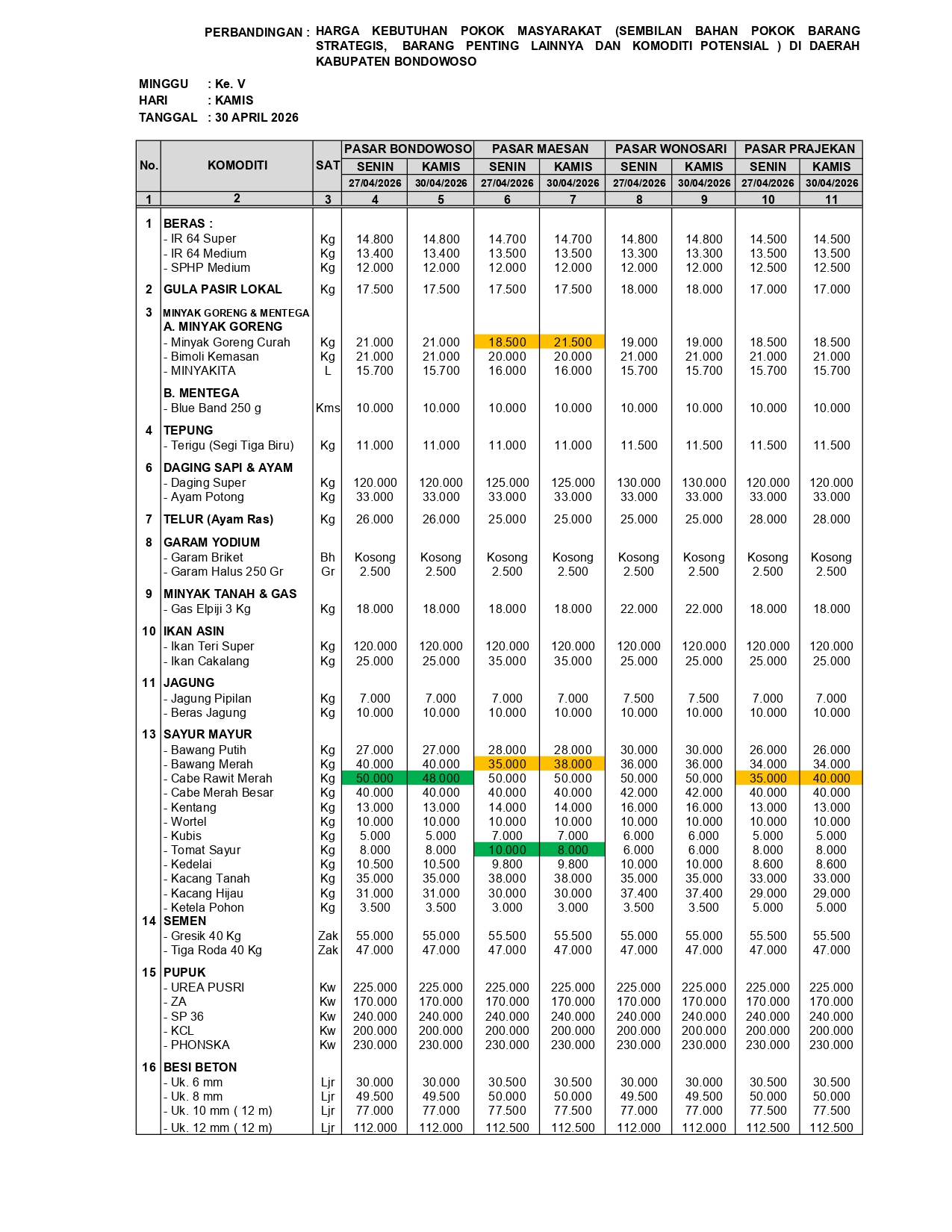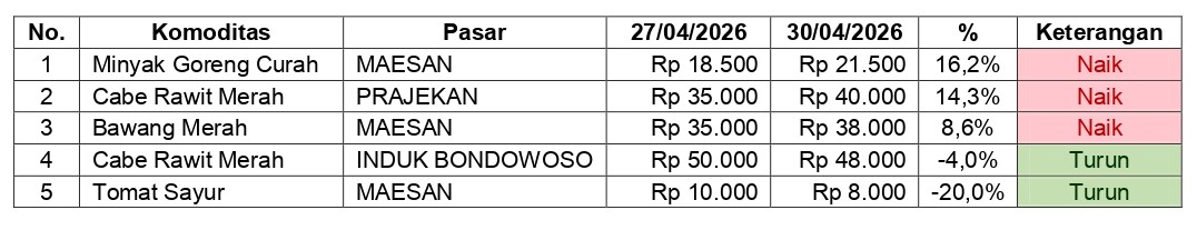 Bondowoso, 30 April 2026 — Harga sejumlah bahan pokok di Kabupaten Bondowoso mengalami fluktuasi pada periode 27 hingga 30 April 2026. Berdasarkan hasil pemantauan di empat pasar, yakni Pasar Induk Bondowoso, Maesan, Wonosari, dan Prajekan, kenaikan dan penurunan harga terjadi pada beberapa komoditas utama.