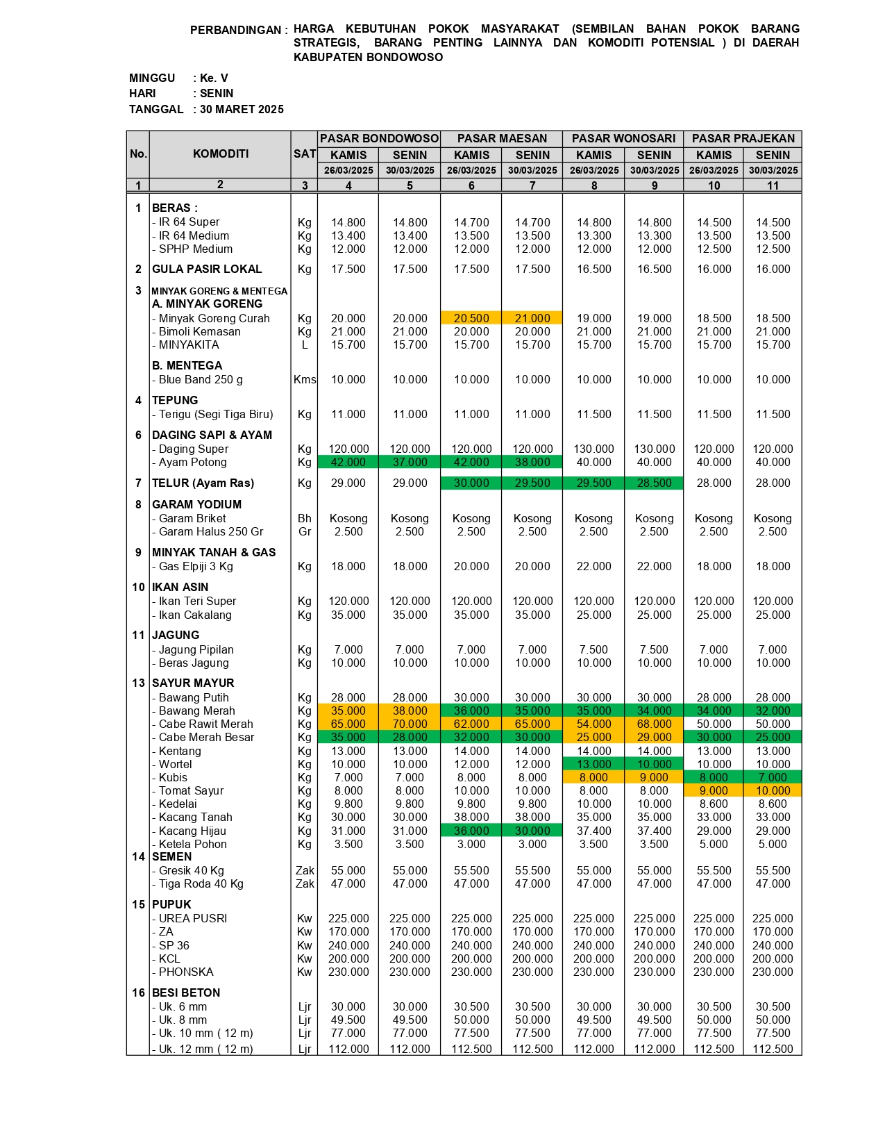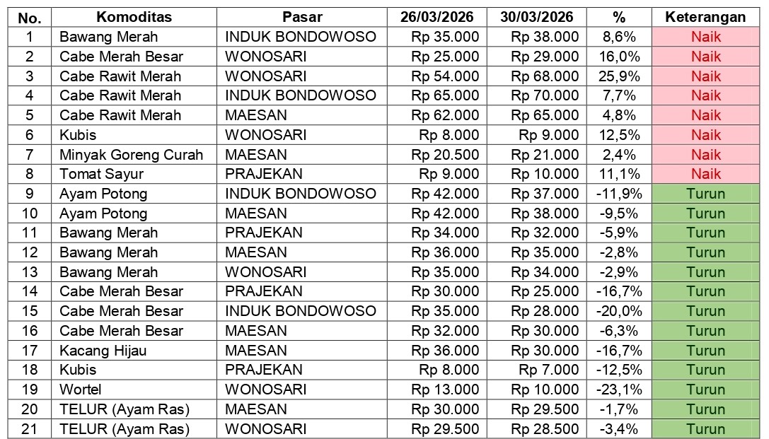 Pemerintah Kabupaten Bondowoso melalui kegiatan monitoring rutin perkembangan harga bahan pokok dan barang strategis mencatat adanya dinamika harga yang cukup fluktuatif pada periode 26 Maret hingga 30 Maret 2026. Berdasarkan hasil pemantauan di 4 pasar utama Kabupaten Bondowoso yakni Pasar Induk, Maesan, Wonosari dan Prajekan, sejumlah komoditas menunjukkan perubahan harga baik kenaikan maupun penurunan, dengan disparitas yang bervariasi antar komoditas dan lokasi pasar.