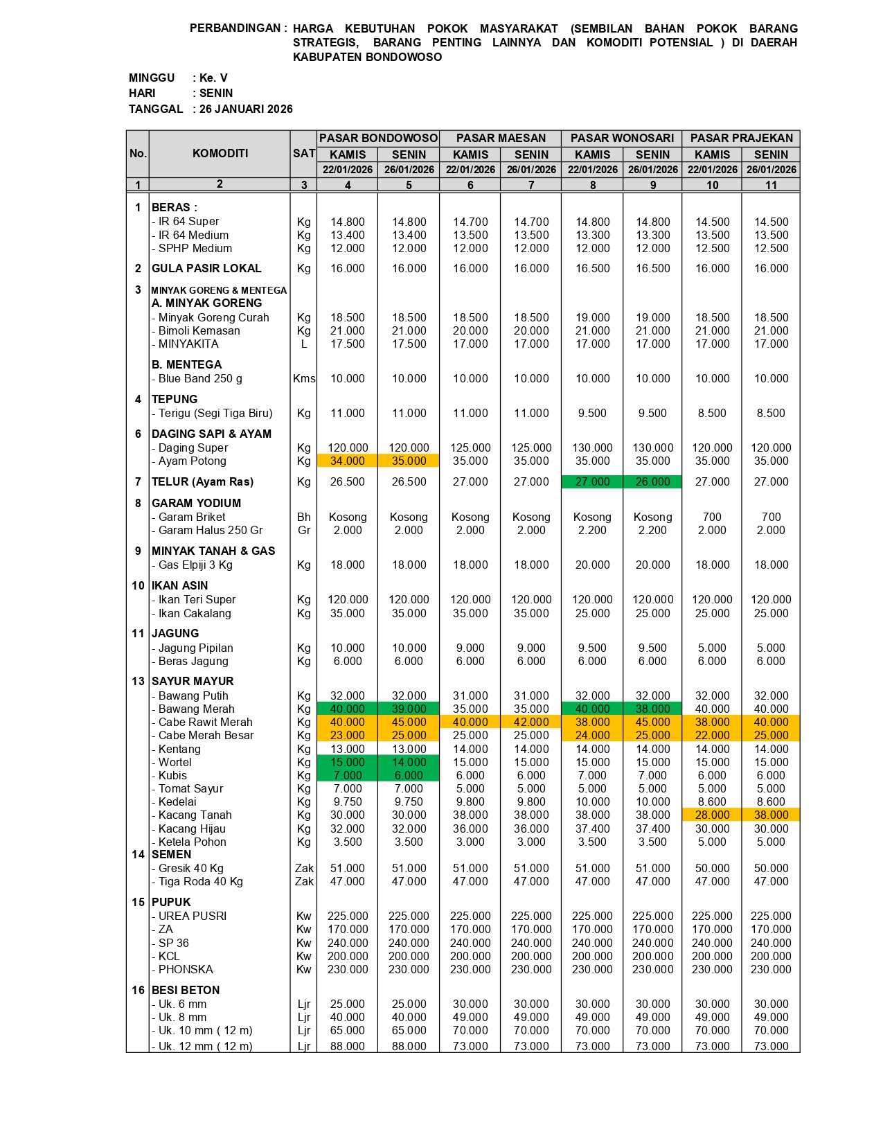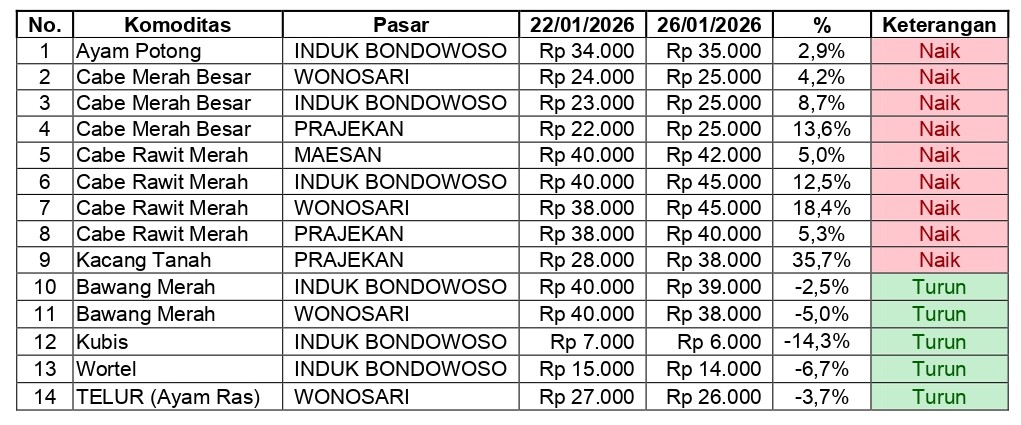 Bondowoso-Berdasarkan laporan hasil monitoring perkembangan harga sembilan bahan pokok kebutuhan masyarakat, barang strategis, dan barang penting lainnya pada tanggal 26 Januari 2026, terpantau adanya dinamika pergerakan harga pada sejumlah komoditas di empat pasar utama (pasar pantauan) Kabupaten Bondowoso yakni Pasar Induk, Maesan, Wonosari dan Prajekan.